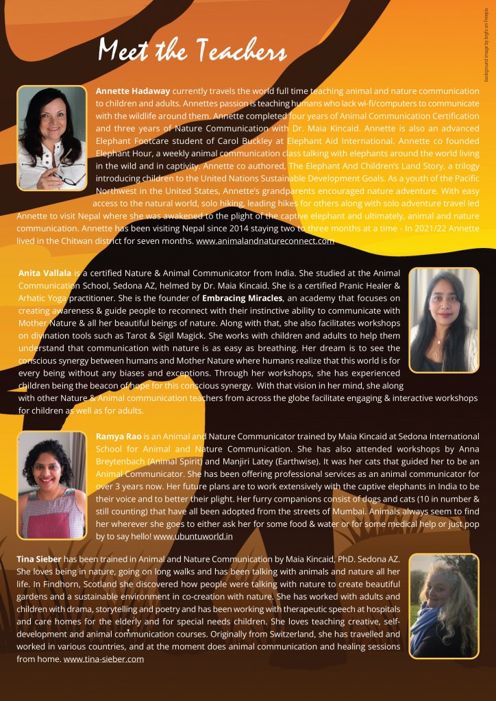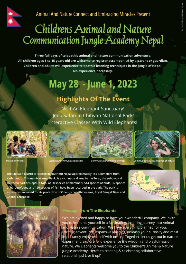 Children’s academies – global Experiences guiding children to learn animal and nature communication on a deeper level while experiencing nature around them.